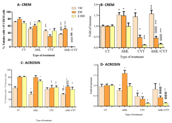 Next, we investigated the effect of AML and CYT alone or in combination on the meiotic (CREM) and post-meiotic (ACROSIN) stages. The quantification analysis of immunofluorescent staining and expression levels of CREM and ACROSIN was performed (Figure 5A–D). For quantitative analysis, we considered/counted only tubules with more than 15 CREM-stained cells (see Figure S2A). Our results show a significant decrease in the percentage of tubules with more than 15 CREM-stained cells in the AML group (1–2 weeks post treatment) and CYT alone or in combination with AML (1–2.5 weeks post treatment) compared to the control group (Figure 5A), whereas the percentages of tubules with more than 15 CREM-stained cells were significantly decreased 1–2.5 weeks post treatment in the AML+CYT group compared to AML alone and CYT alone (Figure 5A). However, the RNA expression levels of CREM were significantly increased 1–2 weeks post AML treatment compared to control (Figure 5B). Furthermore, a significantly increased was detected 1 week post CYT treatment, but a significant decrease was detected 2–2.5 weeks post CYT treatment compared to control (Figure 5B). On the other hand, treatment of immature mice with AML+CYT did not significantly affect CREM expression levels compared to treatment with CYT alone (Figure 5B).