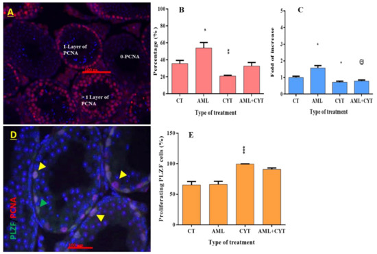 Effect of AML and CYT on testicular cell proliferation and cell proliferation of premeiotic cells in testicular tissue of immature treated mice. Mice and testes were treated as described in Figure 1. Fixed testicular tissues were immunoassayed with specific anti-PCNA antibodies to identify the proliferating cells and anti-PLZF antibodies to identify the premeiotic cells. Tubules with PCNA-positive cells are presented as % of tubules with one layer of PCNA-positive cells. Immunostaining (A) and quantification of the staining (B). The RNA expression levels of PCNA in the testes isolated from each treatment group were examined by qPCR analysis using specific primers (C), and housekeeping gene (GAPDH) was used as internal control. The results are presented as fold of increase compared to GAPDH. Testicular tissues were immunoassayed with specific anti-PLZF and anti-PCNA antibodies to identify the proliferating premeiotic cells. Tubules with doubled positive cells are presented as % of proliferating PLZF cells. Immunostaining (D) and quantification of the staining (E). N = 3; n = 5–7/group; #tubules/group = 40–110; n = 5–7/group (RNA expression). * (p < 0.05), ** (p < 0.01), *** (p < 0.001) significant relative to control group. @ (p < 0.05) significant relative to AML group. Green arrow indicates PLZF-positive stained cells. Yellow arrow indicates proliferating PLZF-positive stained cells.