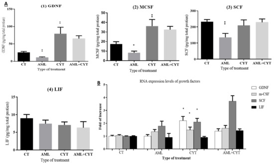 Following the examination of the effect of AML and CYT on spermatogenesis, we investigated the effect of those treatments on the testicular growth factors and cytokines mainly secreted from testicular somatic cells (microenvironment of the SSCs) involved in the regulation of spermatogonial cell maintenance, proliferation and differentiation. Our results show that AML significantly decreased the protein levels of GDNF, MCSF and SCF but not LIF compared to control (Figure 7A; 1–4, respectively). However, CYT significantly increased the protein levels of GDNF and MCSF, although it did not affect the protein levels of SCF and LIF at the same time point post injection. In terms of RNA expression level, AML did not show a significant effect on any of the examined growth factors, and CYT showed a similar effect on the expression levels and protein levels of the examined factors (Figure 7A,B).