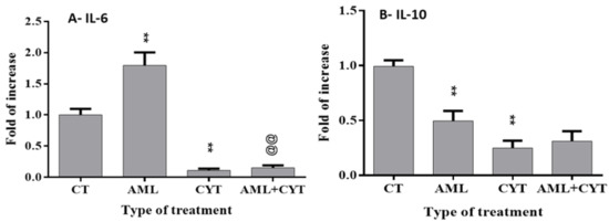 In addition, our results show that AML treatment significantly increased the RNA expression level of the proinflammatory cytokine (IL-6), whereas CYT treatment decreased it significantly (Figure 8A). Furthermore, AML+CYT did not show an additive or synergistic effect on IL-6 expression levels (Figure 8A). However, AML alone and CYT alone significantly decreased the RNA expression level of the anti-inflammatory cytokine (IL-10) (Figure 8B). On the other hand, AML+CYT did not show an additive or synergistic effect on IL-10 expression levels (Figure 8B).
