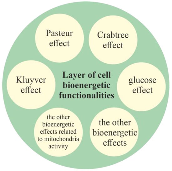 The layer of cell bioenergetic functionalities, as layer that contains functionalities of main bioenergetic engines of cell life and development, is localized in the innermost part of the model (Figure 1). The layer of cell bioenergetic functionalities includes the bioenergetic functionalities needed for life, including, functionalities responsible, inter alia, for the occurrence of the Pasteur, Crabtree, Kluyver and glucose effects (i.e., functionalities that constitute the functionalities of unified cell bioenergetics). Is should be noted that in accordance with the endosymbiotic theory, mitochondria are the early prokaryotic endosymbionts that entered a larger cell about 1.5 billion years ago (i.e., during the process of transition of prokaryotic cells into unicellular eukaryotic cells) []. Because mitochondria constitute the main powerhouses the of cells, the other bioenergetic effects related to mitochondrial activity are part of the layer of cell bioenergetic functionalities.