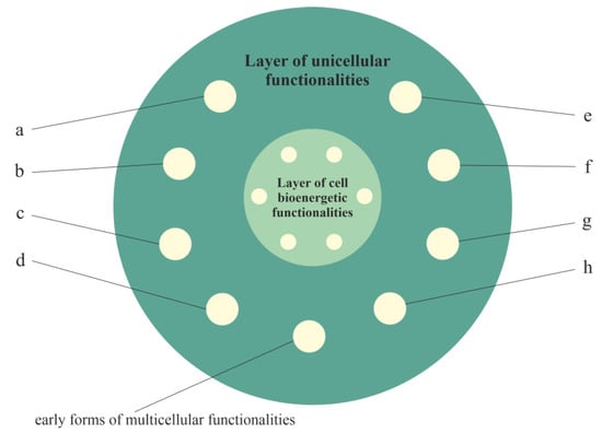 The activity of functionalities of the cell bioenergetic layer has to be controlled (i.e., integrated and synchronized by appropriate stimulation and inhibition) to meet the cell’s bioenergetic requirements. According to the proposed model, during evolution of unicellular organisms, functionalities of the unicellular layer were formed that used, controlled and extended the functionalities of the cell bioenergetic layer (Figure 2). This layer (i.e., the layer of unicellular functionalities) provides basic life functionalities, including competition, survival and proliferation of unicellular organisms. These functionalities belong to the most conserved and protected functionalities supported by a myriad of built-in redundant pathways []. The plethora of built-in redundant pathways also indicates that these functionalities are very elastics and adaptive, i.e., they can remain active in a heavily altered environment, despite changes in the genome.