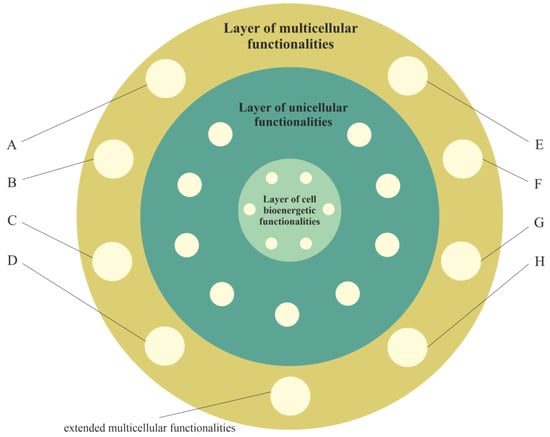 The evolution of multicellularity required the integration of single cells into new functionally, reproductively and evolutionary stable multicellular organisms []. This process required new functionalities. According to the proposed model, during evolution of multicellular organisms, functionalities of the new layer were formed that could use, control and extend both the functionalities of the layer of unicellular functionalities and layer of cell bioenergetic functionalities (Figure 3). This layer (i.e., the layer of multicellular functionalities) provides complex life functionalities to multicellular organisms, including extended functionalities of proliferation, cell–cell communication, coordination, integration, adhesion to neighboring cells, signaling to maintain adhesion and programmed cell death. These functionalities are presented in Figure 3 as extended multicellular functionalities.