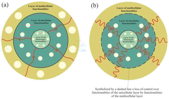 Propagation of disturbances in cell bioenergetics. (a) Small disturbances cause small disturbances in functionalities of the unicellular and multicellular layers. (b) Huge disturbances can cause a loss of functionalities of the multicellular layer (or huge disturbances in their operation), leading to a loss of control over unicellular layer functionalities.