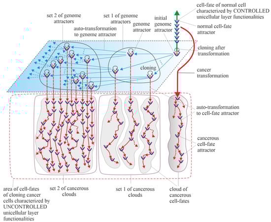 Schematic view of the universal model of cancer transformation and development presented from the perspective of the layered model of evolution of cellular functionalities (especially from the perspective of losing control over functionalities of the unicellular layer). After cancer transformation, cancer development occurs as the development of a population of individual cloning cells. Moreover, cancer development shows attractor-like behavior, i.e., vertical cancer development occurs through step-by-step changes of cell-fate attractors, and optional horizontal cancer development occurs through step-by-step changes in genome attractors.