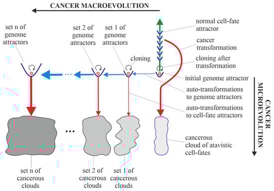 The Warburg effect, a phenomenon associated with cancer transformation and development, causes intensive stimulation of fermentation under good aerobic conditions [,,]. Intensive fermentation allows cells to obtain needed energy during glycolysis. The rate of energy attainment after cancer transformation from intensive glycolysis can be higher than the rate of energy attainment from oxidative phosphorylation (OXPHOS). OXPHOS is a very effective way to obtain energy, but taking into account that a possible fermentation rate can be 100 times quicker than the oxidative process of ATP generation by mitochondria, the rate of energy attainment from glycolysis (i.e., in the glycolysis-fermentation pathway) can be about six times higher in comparison to OXPHOS [,]. After transformation, the large amount of obtained energy in the glycolysis-fermentation pathway prevents discharge of mitochondria from high-energy molecules []. As a result, this phenomenon causes cancer mitochondria to remain overenergized. Overenergization, as an internal cell problem, is a factor that drives cancer vertical development (i.e., cancer microevolution) and cancer horizontal development (i.e., cancer macroevolution) (Figure 6). A large amount of obtained energy after transformation also allows for intensive cell cloning, which creates a network of cell fates (herein termed “cloud of cell-fates”). A cloud of cell fates is generated by cells initially trapped in one (initial) genome attractor. Considering the case of horizontal cancer development, the network of genome attractors undergoes gradual and dynamic expansion. As a result, sets of cancerous clouds (that contain cancerous clouds of atavistic cell fates) are generated by cloning cells trapped in a dynamically emerging and altered network of genome attractors, as schematically shown in Figure 6.