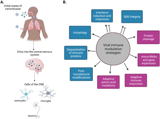 Neurotropic viruses have the capacity to enter the nervous system and establish infection in the CNS, including in neurons (Figure 1A). Neurotropic viruses include members of the families Picornaviridae (poliovirus, non-polio enteroviruses, and coxsackie viruses), Flaviviridae (Japanese encephalitis virus (JEV), West Nile virus (WNV), dengue virus (DENV), and Zika virus (ZIKV)), Rhabdoviridae (Rabies virus (RABV)), Togaviridae (Venezuelan equine encephalitis virus (VEEV), Eastern equine encephalitis virus (EEEV) and Western equine encephalitis virus (WEEV)), Paramyxoviridae (mumps virus, measles virus (MV) and Nipah virus (NiV)), Bunyaviridiae (La Crosse virus and Rift Valley fever virus), and Coronaviridae(severe acute respiratory syndrome coronavirus 2 (SARS-CoV-2)). Although there are several DNA viruses and retroviruses that are neurotropic, such as herpes simplex virus, Epstein–Barr virus, or human immunodeficiency virus (highlighted in [4,5,6]), this review will focus on neurotropic RNA viruses causing diseases in humans. Sindbis virus and vesicular stomatitis virus are neurotropic in mice and therefore will not be discussed here. Table 1 highlights several neurotropic viruses and the CNS manifestations during viral infection. Below we outline the various immune antagonism strategies utilized by neurotropic RNA viruses (Figure 1B).