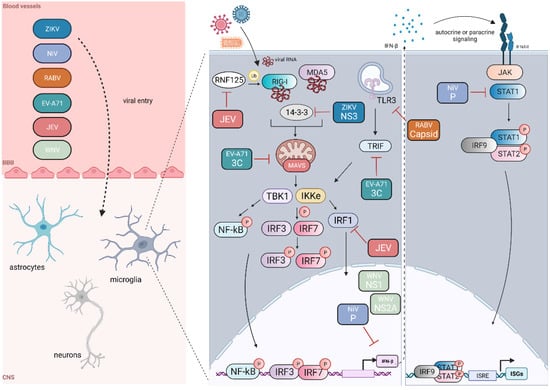 Neurotropic RNA virus evasion of IFN-β induction and responses in the CNS. Several RNA viruses can bypass the blood–brain barrier (BBB) through the circulatory system and enter the cells of the central nervous system (CNS). We also note that viral entry into the CNS may occur through other routes in addition to the circulatory vessels depicted within microglia; these viruses can block (red inhibitory arrows) components of the RIG-I signaling pathway, blocking IFN-β induction and subsequent JAK-STAT interferon signaling. Black arrows indicate subsequent steps within the signaling pathway or translocation from the cytoplasm to the nucleus. Created with BioRender.com.