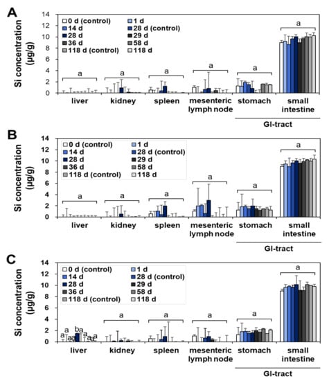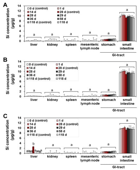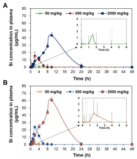 - Lee, J.A.; Kim, M.K.; Paek, H.J.; Kim, Y.R.; Kim, M.K.; Lee, J.K.; Jeong, J.; Choi, S.J. Tissue distribution and excretion kinetics of orally administered silica nanoparticles in rats. Int. J. Nanomed. 2014, 9, 251–260. [Google Scholar]