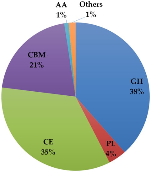 Initially, a bank of 1955 genes encoding biochemically characterized CAZymes was constructed. All gene sequences were analyzed using a gene alignment algorithm to exclude highly similar sequences, explore the CAZy family’s diversity, and include a broad range of EC numbers. As a result, 1476 enzymes of several classes, families, and EC numbers were selected. The list of proteins included enzymes from 412 different source organisms, predominantly from bacteria but also from the other domains: Bacteria (1435 targets), Eukaryote (26 targets), and Archaea (15 targets). The 1476 en-zymes comprised 568 GHs, 58 PLs, 510 CEs, 14 AAs, 304 CBMs, and 22 others (containing different catalytic domains) (Figure 1). Some sequences were designed to include just a single module while others were maintained in their native form and all the modules were expressed. All predicted signal peptides were removed from the target sequences.