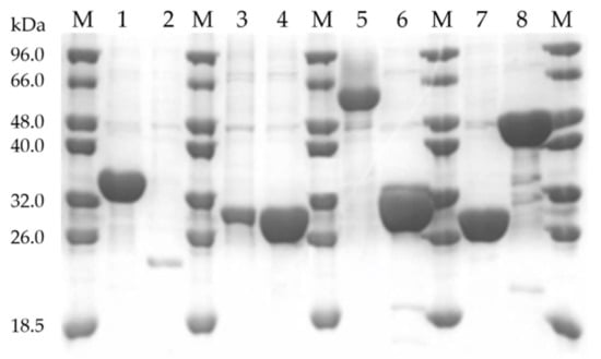 Protein expression and purity analysis of CAZymes exemplified by SDS-PAGE. Lane M contains NZYTech Low Molecular Weight (LMW) Protein Marker; Lanes 1–8 contain purified recombinant proteins with the following accession numbers: (1) ABD81807.1, (2) AAK06049.1, (3) AAG04556.1, (4) CAA84537.1, (5) CAC83072.1, (6) CAA84537.1, (7) CAB55348.1, and (8) AAP09638.1.