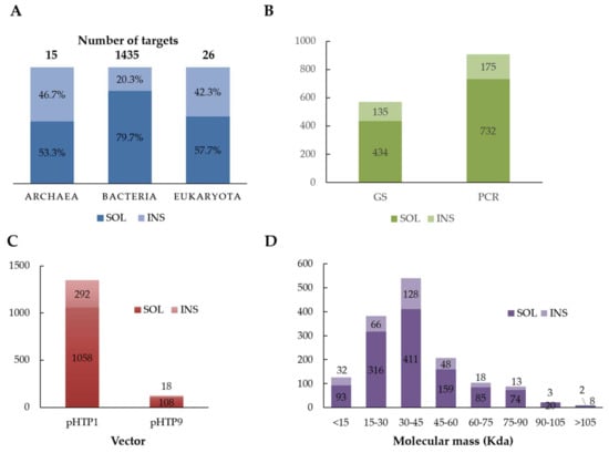 Efficacy of the recombinant production of CAZymes. (A) The three domains of life (proportion of recombinant proteins obtained among eukaryotic, bacteria, and archaea targets); (B) production strategy (GS, genes synthetized with codon-optimization for E. coli; PCR, genes obtained from genomic DNA); (C) expression vectors: pHTP1, expression vector encoding an N-terminal histidine tag; pHTP9, vector containing an N-terminal GFP tag; (D) protein’s molecular mass distribution. SOL: soluble protein, INS: insoluble protein.