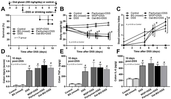 Schema of the experiments (A, upper part) and characteristics of mice with drinking water (Control) with or without oral β-glucan gavage using whole-glucan particles (WGP), Pachyman or Oat glucans (Oat-BG), which are combined into the BG (mixed) group, or dextran sulfate solution with or without several glucans. Survival analysis (A), bodyweight alteration (B), stool consistency index (C), colon injury score from Hematoxylin and Eosin (H&E) staining (D), and colon cytokines (TNF-α and IL-6) (E,F) are shown (n = 6–8/group). #, p < 0.05 vs. Control as determined by ANOVA with Tukey’s analysis. Data from oral glucan-administered mice using different types of glucans were combined as BG (mixed) due to the nonsignificant difference between groups.