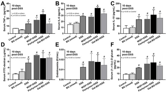 Characteristics of mice with drinking water (Control) with or without oral β-glucan gavage using whole-glucan particles (WGP), Pachyman, or Oat glucans (Oat-BG), which are combined into the BG (mixed) group, or dextran sulfate solution with or without several glucans, as indicated by serum cytokines (TNF-α, IL-6, and IL-10) (A–C); gut permeability (FITC-dextran assay) (D); endotoxemia (E); and serum (1→3)-β-D-glucan (BG) (F), which are shown (n = 6–8/group). #, p < 0.05 vs. Control; *, p < 0.05 vs. other groups as determined by ANOVA with Tukey’s analysis. Data from oral glucan-administered mice using different types of glucans were combined as BG (mixed) due to the nonsignificant differences between groups.