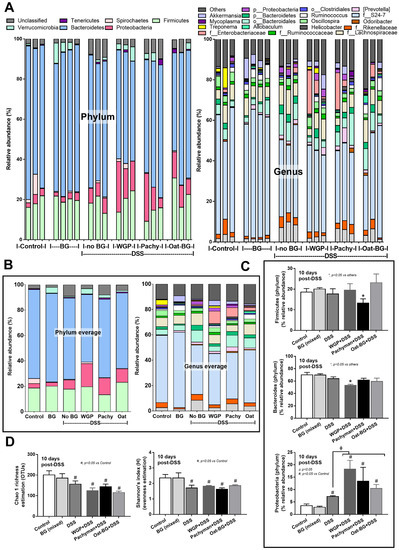 Fecal microbiome analysis from mice. Dextran sulfate solution (DSS) with or without several glucans using whole-glucan particles (WGP), Pachyman, or Oat glucans (Oat-BG) was performed. Meanwhile, in nondrinking water (Control) with oral β-glucans gavage, only one of these glucans was used in each mouse, but the data are combined into the BG (mixed) group. Phylum and genus level determination (A), average value of the analysis (B), graph presentation in the phylum analysis (C), and bacterial diversity (D) are shown (n = 3–4/group). #, p < 0.05 vs. Control; *, p < 0.05 vs. other groups; ϕ, p < 0.05 vs. the indicated group as determined by ANOVA with Tukey’s analysis. Data from oral glucan-administered mice using different types of glucans were combined as BG (mixed) due to the nonsignificant differences between these groups.