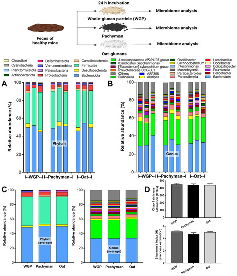 Fecal microbiome analysis of the feces of healthy mice after 24 h of incubation with whole-glucan particles (WGP), Pachyman, or Oat glucans (Oat), as presented in the schema of the experiments, characterized by phylum and genus level determination (A,B), the average value of the analysis (C), and the bacterial diversity (D) (n = 3/group).
