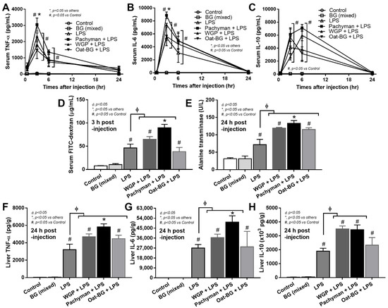 Due to hepatic detoxification [44] of blood PAMPs (including glucans), liver injury was explored. Serum alanine transaminase (ALT; liver enzyme) and liver cytokines (TNF-α and IL-6 but not IL-10) were higher in Pachyman–LPS mice than other LPS–BG combinations (Figure 5E–H). At 24 h post-injection, WGP with LPS induced higher ALT and liver cytokines (TNF-α, IL-6, and IL-10), while Oat-BG with LPS induced only higher ALT and liver TNF-α compared to LPS injection alone (Figure 5E–H).