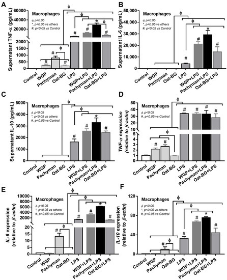Characteristics of bone marrow-derived macrophages after 24 h of incubation in the control medium (Control) or control medium supplemented with whole-glucan particles (WGP), Pachyman, Oat glucans (Oat-BG), lipopolysaccharide (LPS), and LPS with the different glucans. Supernatant cytokines (TNF-α, IL-6, and IL-10) with gene expression (A–F) are shown (n = 6–8/group). #, p < 0.05 vs. Control; *, p < 0.05 vs. other groups; ϕ, p < 0.05 vs. the indicated group as calculated by ANOVA with Tukey’s analysis. Independent triplicate experiments were performed.