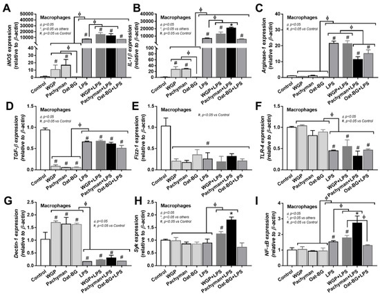 Gene expression characteristics of bone marrow-derived macrophages after 24 h of incubation in the control medium (Control) or supplemented with whole-glucan particles (WGP), Pachyman, Oat glucans (Oat-BG), lipopolysaccharide (LPS), and LPS with the different glucans. Pro- (iNOS and IL-1β) and anti- inflammatory responses (Arginase-1, TGF-β, and Fizz-1) (A–E) with the signaling genes (TLR-4, Dectin-1, Syk, and NF-κB) (F–I) are shown (n = 6–8/group). #, p < 0.05 vs. Control; *, p < 0.05 vs. other groups; ϕ, p < 0.05 vs. the indicated group as calculated by ANOVA with Tukey’s analysis. Independent triplicate experiments were performed.