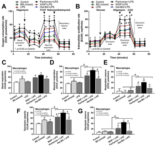 Characteristics of bone marrow-derived macrophages after 24 h of incubation in the control medium (Control) or with or without different forms of β-glucans using whole-glucan particles (WGP), Pachyman, or Oat glucans (Oat-BG), which are combined into the BG (mixed) group, or lipopolysaccharide (LPS) with or without these glucans. Extracellular metabolite flux analysis patterns, including oxygen consumption rate (OCR) of the mitochondrial function (A) and extracellular acidification rate (ECAR) of glycolysis activity (B) with the graph presentation of mitochondrial (basal respiration, maximal respiration, and respiratory reserve) (C–E) and glycolysis (glycolysis capacity and glycolysis reserve) (F,G) parameters, which are shown (n = 6–8/group). #, p < 0.05 vs. Control; *, p < 0.05 vs. other groups; ϕ, p < 0.05 vs. the indicated group. ANOVA with Tukey’s analysis was used. Data from oral glucan-administered mice using different types of glucans were combined as BG (mixed) due to the nonsignificant differences between groups and independent triplicate experiments were performed.