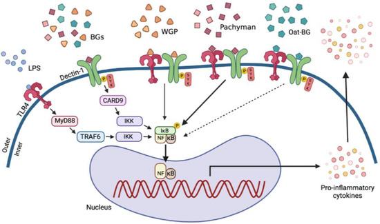 Despite the Dectin-1-dependent recognition of all forms of BG, the potency of BG downstream signaling by Pachyman seems to be more profound compared to WGP and Oat-BG, as indicated by the level of upregulation of Syk and NF-κB in LPS with Pachyman or WGP compared with LPS activation alone or with Oat-BG. These differences might, partly, be due to differences in the structures of BGs that are associated with the quality of the interaction between the Dectin-1 and TLR-4 signal transduction pathways [48,64,82] (Figure 9). In addition, the possibility of particulate BG ligating both Dectin-1 and TLR4, with synergistic activation enhancement, has been demonstrated in cells transfected with these receptors [79]. Although there is limited exploration of TLR-4 and Dectin-1 ligation by BG, several publications have described TLR4 ligation [83]. We hypothesize that Syk might be responsible for the enhanced LPS-glucans proinflammatory effect, because Syk is (i) directly downstream of Dectin-1 [84], (ii) an alternative (non-MyD88) downstream signal of TLR-4 [85,86], and (iii) one of the major downstream signals after the respective ligation of Dectin-1 and TLR-4 by their respective ligands [64]. It is possible that the β-(1→3) structure of Pachyman, being limited-branching β-(1→3) glucans different from WGP with multiple β-(1→6)-glycosidic branches, Oat-BG, and β-(1→4)-glycosidic linkages, might be responsible for the more effective crosslinks with more profound downstream signals. Additionally, the enhanced cell energy reserve (glycolysis and respiratory reserves) was only demonstrated in WGP and Pachyman but not in Oat-BG, in correlation with the inflammatory activation, possibly to produce the adequate energy for the facilitated inflammatory cell activities [11,87]. More studies on this topic are warranted.