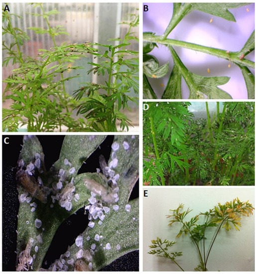 Carrot psyllid Bactericera trigonica population on a carrot plant (A), eggs laid in leaves and stems (B), sugary secretions from adult carrot psyllids on carrot leaves (C,D) and symptoms of leaf yellowing on a carrot seedling after infection with Liberibacter solanacearum (E).