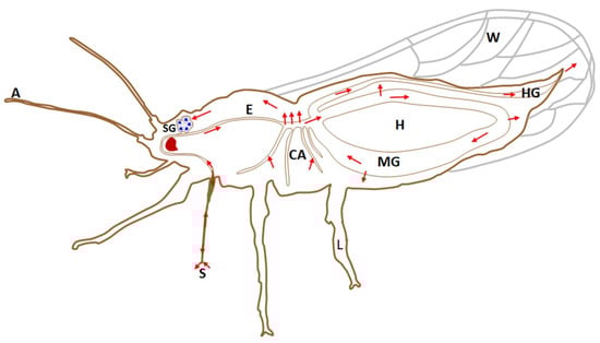 A graphical illustration of the internal anatomy and organs of an adult psyllid, showing the circulative pathway that bacteria of the genus Liberibacter pass through during the transmission process. Red arrows show the pathway, which starts with acquisition from an infected plant through the stylet (S), moves along the esophagus (E), reaches the midgut (MG), where the bacterium is absorbed into the hemolymph (H), circulates and reaches the salivary glands (SG), from which it is secreted into the newly infected plant through the salivary canal in the stylet. A, antennae; CA, caeca; W, wings; HG, hindgut; L, leg.