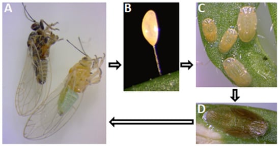 - Inoue, H.; Ohnishi, J.; Ito, T.; Tomimura, K.; Miyata, S.; Iwanami, T.; Ashihara, W. Enhanced proliferation and efficient transmission of Candidatus Liberibacter asiaticus by adult Diaphorina citri after acquisition feeding in the nymphal stage. Ann. Appl. Biol. 2009, 155, 29–36. [Google Scholar] [CrossRef]