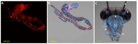 Localisation of Liberibacter solanacearum (CLso) in the midgut of an adult psyllid (A, B) and in salivary glands (C), using fluorescence in situ hybridisation (FISH). A (dark field), B (bright field) and C (bright field of an adult head) show the localisation of CLso (red) as a stripe-like pattern in the midgut and a scattered pattern in the salivary glands (white arrows). Blue in all images is DAPI staining of the nuclei. A, antennae; E, eyes; B, brain.