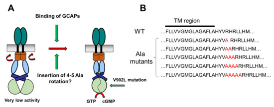 Hypothesis regarding photoreceptor GC-E reaching the active state. (A) Activation of GC-E by GCAPs could trigger a rotation in the cytoplasmic part of GC-E, leading to the active state. The point mutation V902L leads to a constitutively active state of human GC-E [27]. (B) Insertion of Ala residues (red) after the TM region of human GC-E.