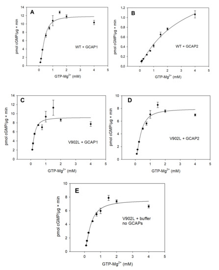 Functional analysis of WT and V902L mutant of human GC-E. Human GC-E variants were expressed in HEK293 cells and incubated with GCAP1 or GCAP2 at increasing Mg-GTP concentrations (in mM). Activities of WT GC-E in the presence of 5 µM GCAP1 (A) or 5 µM GCAP2 (B) (n = 3). (C,D) The corresponding data sets obtained with the V902L mutant. (E) Constitutive activity of V902L in the absence of GCAPs. (n = 3).