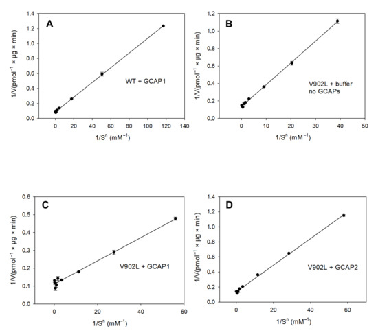 Lineweaver–Burk plot analysis of GC activities. GC-E variants were analyzed as indicated: WT GC-E in the presence of GCAP1 (A) and mutant V902L (B) in the absence of GCAPs. V902L mutant in the presence of GCAP1 (C) and GCAP2 (D). Reciprocal substrate GTP concentration 1/S is given in (mM−1). Kinetics, as shown in Figure 3, showed deviations from an ideal Michaelis–Menten model. We linearized the plots by using apparent Hill coefficients of h = 2.07 (WT + GCAP1), h = 1.58 (V902L + buffer, no GCAPs), h = 1.75 (V902L + GCAP1), and h = 1.76 (V902L + GCAP2).