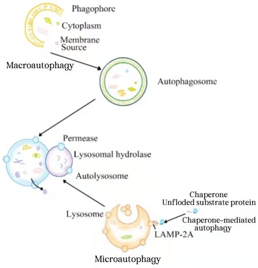 Autophagy is a stable mechanism in eukaryotic cells. In this process, the abnormal proteins, pathogens, and organelles are wrapped by double membranes to form autophagosomes and then transferred to lysosomes for subsequent degradation [,,,]. It is well-known that autophagy is induced by various environmental stresses, such as hypoxia, nutrient deficiency, and growth factor deficiency, so as to eliminate the damage caused by these pressures and return to normal level after stress relief []. Autophagy is categorized into macroautophagy, microautophagy, and chaperone-mediated autophagy according to the differences in the target specificity, inducing signal, action time, and delivery pathway to lysosomes [,,]. Macroautophagy is a conservative stress response process. The target substances, such as invading pathogens and damaged mitochondria, are isolated in double membrane vesicles called autophagosomes and transported to lysosomes for degradation [,]. Microautophagy refers to the direct phagocytosis of cargo in endoplasmic/lysosomal membrane invagination []. Chaperone-mediated autophagy is a type of selective autophagy, in which the proteins to be degraded in cells first bind to molecular chaperones, and then are degraded by lysosomal enzymes(Figure 1) [,]. Under physiological conditions, autophagy is usually maintained at a basic level. When stimulated by stressors, the significantly enhanced autophagy eliminates the abnormal proteins in cells to facilitate cell survival []. If autophagy is maintained at a high level for long time, it will cause cell death. Therefore, the effect of autophagy is a “double-edged sword” [,]. Autophagy plays an important role in many physiological and pathological processes, such as immune response, anti-aging, development, tumor inhibition [,,], neurodegenerative diseases [], cardiovascular diseases [], infection and immunity []. However, the relevant mechanism is not completely clear.