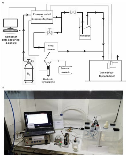 - Exposition of each sample in the gas chamber under a constant flow of humid air in the absence and in the presence of an increasing concentration of benzene;