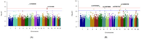 Six SNPs at two loci showed genome-wide significant evidence for association with change in CMT, p < 5 × 10−8 (Figure 1A; Table 2). These included a single SNP, rs78466540, near cancer susceptibility candidate 15 (CASC15) gene on chromosome 6 (Supplementary Materials: Supplement: Figure S4A) and five SNPs, rs11614480 (lead SNP), rs11615848, rs11614887, rs11615870, rs11615833, in linkage disequilibrium (LD) near RP11-116D17.1 on chromosome 12 (Supplementary Materials: Supplement: Figure S4B). The details of all SNPs at each significant or suggestive locus are given in Supplementary Materials: SNP.xlsx (Sheet-1) and the corresponding Quantile–Quantile (Q–Q) plot in Supplementary Materials: Supplement: Figure S3A.