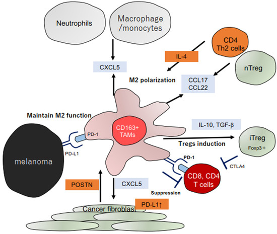 Cancer stromal factors stimulate TAMs and subsequently produce characteristic chemokines and angiogenetic factors in each tumor site of skin cancers to maintain the immunosuppressive microenvironment [11,18]. In many skin cancers such as melanoma, cSCC, EMPD, and CTCL, TAMs produce immunosuppressive chemokines that attract other immunosuppressive cells such as myeloid-derived suppressor cells (MDSCs), Tregs, and tumor-associated neutrophils (TANs) [11]. For example, POSTN from CAFs stimulates TAMs to produce CXCL5 to enhance PD-L1 expression in TAMs, maintaining regulatory T cells in melanoma [76] (Figure 1). In addition, these immune checkpoint modulators (e.g., programmed death ligand 1 [PD-L1], B7-H3, B7-H4) expressed by TAMs [22] directly suppress activated T cells and maintained regulatory T cells in vivo [77]. Moreover, CXCL5 recruits monocytes as a precursor of TAMs, and since POSTN also stimulates TAMs to produce CCL22 attracting Th2 [40], IL-4 produced by Th2 polarizes monocytes to M2-polarized TAMs [11] (Figure 1). In aggregate, TAM-related chemokines develop the immunosuppressive microenvironment of melanoma, suggesting that TAMs could be a target for immunotherapy.