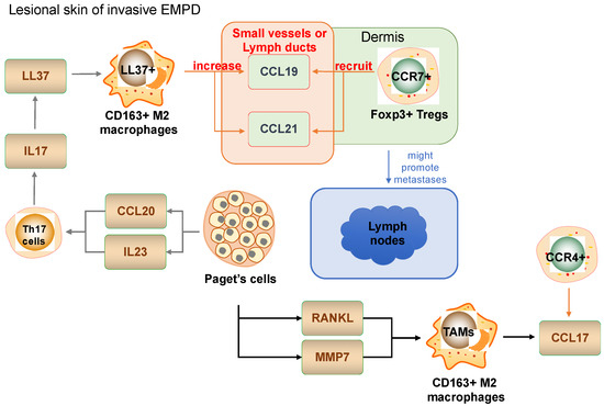 Possible immunological pathways in lesional skin of invasive EMPD.