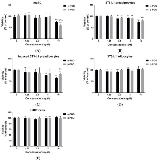 The biological activity of repeated α-PGG or β-PGG treatment in various stages of the adipocyte lifecycle was compared. Confirmation of the chemical structure and purity of α-PGG and β-PGG was made before carrying out the experiments (Figure S1). PGG treatment was administrated three times, once every two days, prior to the cell assay. The PGG administration scheme was repeated for all stages of the adipocyte lifecycle. Figure 1A shows that both α- and β-PGG reduce the viability of hMSC (p < 0.001). β-PGG has a greater effect than α-PGG (p < 0.001). When 3T3-L1 fibroblasts/pre-adipocytes were subjected to PGG treatment, the viability of 3T3-L1 cells was reduced as the concentrations increased from 2.5 to 10 μM. The effect observed was the same for both isomers (Figure 1B). When PGG treatment was performed during the adipogenesis stage, there was a decrease in viability at 5 μM of α-PGG (p < 0.001) and at 10 μM of β-PGG (p < 0.001; Figure 1C). For differentiated adipocytes, the viability was mostly unaffected by PGGs (Figure 1D). The viability of hepatoma H4IIE cells was also unaffected by PGG treatment (Figure 1E).