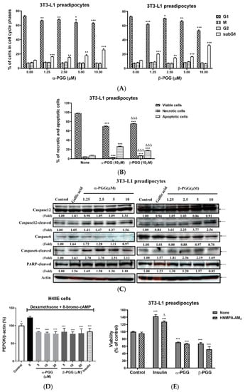 The characteristics of PGG-induced cell death were determined. Figure 2A shows a cell cycle analysis of 3T3-L1 preadipocytes that are treated with PGG. Both α- and β-PGG significantly reduce the cell population in the G1 phase and increase the cell population in the subG1 phase. When annexin-V (for apoptotic cells) and propidium iodide (for necrotic cells) are used for staining, the apoptotic and necrotic cell populations increase after PGG treatment. The apoptotic cell population was greater than the necrotic population. For PGG isomers, α-PGG increased the apoptotic cell population and decreased the necrotic population compared to β-PGG (Figure 2B). Figure 2C shows that both PGG isomers increased the cleaved forms of caspase 12, caspase 6 and Poly ADP-ribose polymerase (PARP) proteins. In contrast, gallic acid treatment only increased cleaved caspase 6 and PARP protein. Figure 2D shows that dexamethasone and 8-bromo-cAMP-induced hepatic phosphoenolpyruvate carboxykinase (PEPCK) mRNA expression was inhibited by insulin (10 nM) and both PGG isomers. However, insulin treatment increased the viability of 3T3-L1 preadipocytes, and this effect was dependent on the insulin receptor inhibitor (HNMPA-AM3). The reduction in the viability by α- or β-PGG treatment is unaffected by HNMPA-AM3 (Figure 2E).