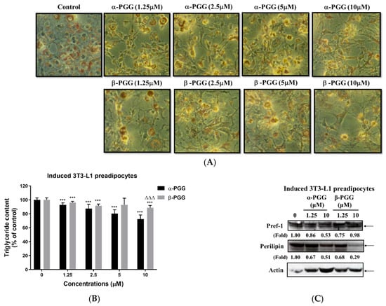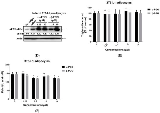 Figure 3A,B shows the inhibitory effect of PGG treatment on the TG content of the 3T3-L1 cells after the induction of adipogenesis. The morphology of differentiated 3T3-L1 adipocytes stained with oil-red O shows that fully differentiated 3T3-L1 adipocytes with multiple oil-droplets accumulate within the cytoplasm. In addition, adipocytes that are treated with PGG are poorly differentiated, and the morphology has a fibroblast-like shape. In terms of the triglyceride content of these cells, treatment with α- and β-PGG resulted in a significant decrease in TG content at concentrations between 1.25 and 10 μM. α-PGG had a greater effect than β-PGG at 10 μM. Figure 3C shows that at the end of the PGG treatment, pref-1 protein expression is decreased in cells that are treated with α-PGG (10 μM) and β-PGG (1.25 μM). However, perilipin protein expression was also decreased after α- or β-PGG treatment at 10 μM. Once 3T3-L1 preadipocytes transform into differentiated 3T3-L1 adipocytes, adipocyte biomarker adipocyte Protein 2 (aP2), also known as adipocyte lipid–binding protein (FABP4), was expressed in differentiated 3T3-L1 adipocytes. In the presence of α-PGG and β-PGG, aP2 expression was not reduced but was significantly increased after PGGs treatment (Figure 3D). When PGG treatment was employed for differentiated 3T3L-1 adipocytes, the triglyceride content of differentiated 3T3-L1 adipocytes was unaffected by PGG treatment (Figure 3E). However, significantly less free fatty acid was released from differentiated 3T3L-1 adipocytes after α- or β-PGG treatment between concentrations of 2.5 and 10 μM (p < 0.05; Figure 3F).