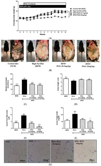The increased weekly food intake (Figure 4C), shortening of the colon (Figure 4D), elevated serum free fatty acid (Figure 4E), and elevated serum triglyceride (Figure 4F) for DIO mice are all attenuated after PGG treatment. Figure 4G,H shows the histology of adipose tissue and shows that hypertrophy of fat cells in DIO mice is ameliorated by PGG treatment in a dose-dependent manner. Therefore, triglyceride content of adipose tissue in DIO mice that are treated with PGG is significantly decreased (Figure 4I).