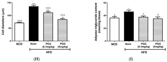Effect of 12 weeks of β-PGG supplementation on body weight, serum lipids and adipose tissue in DIO mice. (A) The weekly body weight of DIO mice treated with PGG (n = 6), (B) images of dissected mice at the end of the PGG treatment, (C) average weekly food intake (n = 6), (D) colon length, (E) serum free fatty acids, (F) serum triglyceride, (G) images of haematoxylin–eosin-stained adipose tissue, (H) diameter of adipocyte cells (n > 50 per group), and (I) adipose tissue TG content. Data are shown as mean ± SEM (n = 4). * p < 0.005, ** p < 0.01, and *** p < 0.001 compared with control diet (NCD) group. ∆ p < 0.05 group and ∆∆∆ p < 0.001 compared with HFD (none) group.