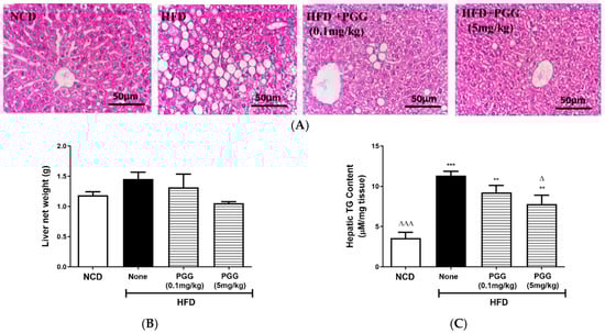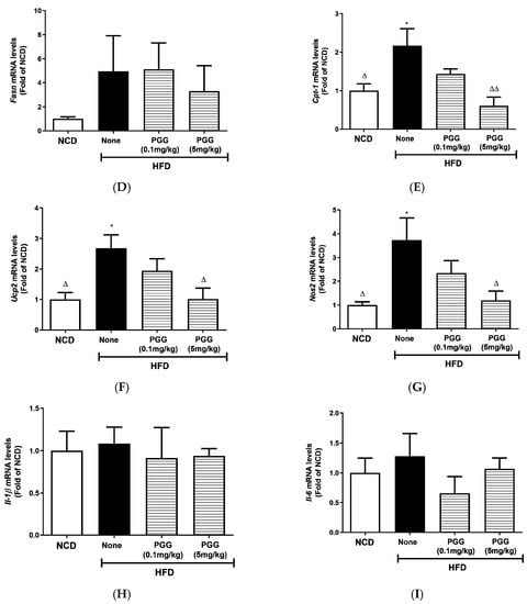 In terms of the effects of PGG treatment on hepatic steatosis on DIO mice, Figure 4A shows that body weight from DIO mice is significantly increased regardless of PGG treatment (p < 0.001). The histological appearance of lipid accumulation in the liver of DIO mice is attenuated by PGG treatment in a dose-dependent manner (Figure 5A). Although liver weight among each group had no statistical difference (Figure 5B), there was decreased hepatic TG content in DIO mice that were treated with PGG (5 mg/kg; Figure 5C). Measurement of gene expression that was related to lipid metabolism and inflammation shows that elevated hepatic CPT-1 (Figure 5E), UCP-2 (Figure 5F) and NOS2 (Figure 5G) mRNA expression in DIO mice was significantly reduced after PGG (5 mg/kg) treatment, but there was no difference between groups in the expression of hepatic FASN (Figure 5D), IL-1β (Figure 5H), and IL-6 (Figure 5I).