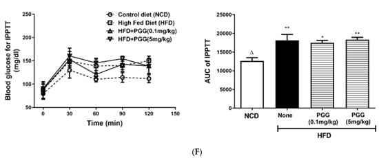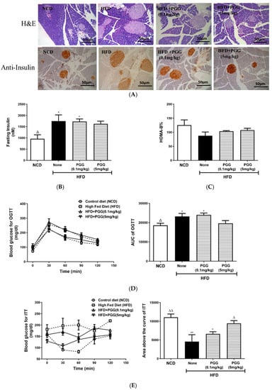 In terms of the effect of PGG supplement on the pancreatic islet function and glycaemic control in DIO mice, hypertrophic islet morphology in DIO mice was ameliorated by PGG treatment (Figure 6A upper panel). However, insulin content of islets was increased in DIO mice treated with PGG (5 mg/kg; Figure 6A, lower panel). Fasting insulin (Figure 6B) and beta-cell function index HOMA-B% (Figure 6C) in DIO mice was similar to that of DIO mice that were treated with PGG, but there was an improvement in both glucose tolerance (no difference when compared to NCD; Figure 6D) and insulin tolerance (p < 0.05 when compared to HFD (none); Figure 6E) in DIO mice that were treated with PGG (5 mg/kg). Finally, PGG treatment did not improve pyruvate intolerance in DIO mice, as shown in Figure 6F.