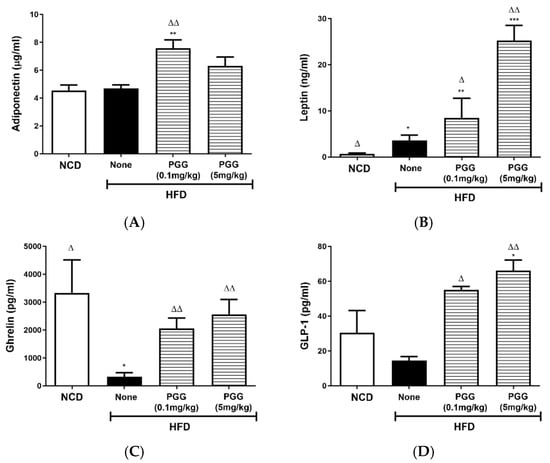 Effect of 12 weeks of β-PGG supplementation on endocrine hormones in DIO mice. Serum levels for (A) adiponectin, (B) leptin, (C) ghrelin, (D) glucagon-like peptide-1 (GLP-1), and (E) gastric inhibitory peptide (GIP) were measured. Data are shown as mean ± SEM (n = 4). * p < 0.05, ** p < 0.01 and *** p < 0.001 compared with control diet (NCD) group or vehicle control group. ∆ p < 0.05 group and ∆∆ p < 0.01 compared with HFD (none) group.