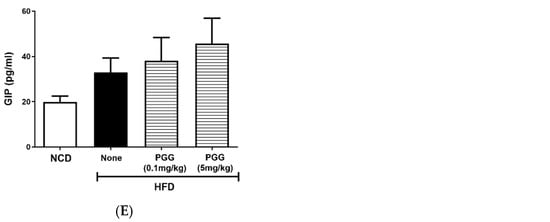 Serum adiponectin levels were significantly elevated (p < 0.01) in DIO mice that were treated with PGG (0.1 m/kg; Figure 7A). Compared to the HFD group, the presence of PGG resulted in a significant elevation in serum leptin, ghrelin and GLP-1 levels (Figure 7B–D). GIP levels for all groups were not statistically different (Figure 7E).