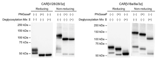 We also carried out Western blot analysis of CAR[V/8a/8a/3z](T154A/S162A), variants of CAR[V/8a/8a/3z] constructed by substitution of an HD threonine and an HD serine with alanine, both believed to be O-linked glycosylation sites. However, these variants formed bands identical to those of the original CAR[V/8a/8a/3z] protein, and treatment with Deglycosylation Mix II caused the bands to shift towards the smaller-molecule side. Thus, we were unfortunately unable to identify O-linked glycosylation sites in CAR[V/8a/8a/3z] (Figure S1).