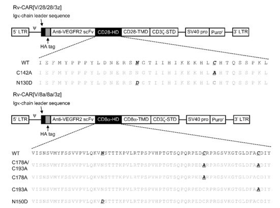 The basic structure of CAR followed the previous report [7]. The notation and structure of various structurally modified CARs and the amino acid sequence of the HD part are summarised in Figure 2. An HA-tag was incorporated into the N-terminus of CAR. We took two CARs consisting of a mouse-VEGFR-specific scFv tandemly linked to a CD28- or CD8α-derived HD/TMD and a CD3ζ-derived STD as our basic structural units. We then constructed six structural variants of these CARs by substituting cysteines in the HD with alanine and by substituting various amino acids in a region described as a potential glycosylation site in the literature [13] as well as in protein databases. In the CD28-derived HD, we substituted one cysteine residue with one alanine and one asparagine that is an N-linked glycosylation site with aspartate. In the CD8α-derived HD, we substituted either one, the other, or both cysteine residues with alanine, in addition to substituting one asparagine, an N-linked glycosylation site, with aspartate.
