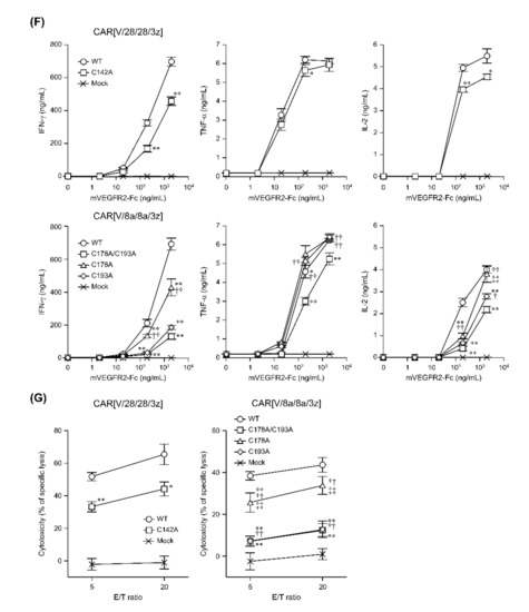Antigen-specific activity was analysed using CAR-T cells on the fourth day of culture, as expression levels of various CAR variants were equivalent. Based on BrdU uptake, the proliferative activity of CAR[V/28/28/3z] and CAR[V/8a/8a/3z] was not affected by the lack of cysteine residues (Figure 3E). Both CAR-T cells showed a similar antigen concentration-dependent growth profile. Regarding cytokine production associated with mVEGFR2 stimulation, CAR[V/28/28/3z](C142A)-T cells had significantly lower levels of IFN-γ and IL-2 production than CAR[V/28/28/3z]-T cells (Figure 3F). CAR[V/8a/8a/3z](C178A)-T cells also exhibited lower levels of IFN-γ and IL-2 production than CAR[V/8a/8a/3z]-T cells, while CAR[V/8a/8a/3z](C193A)-T cells demonstrated even lower production than CAR[V/8a/8a/3z](C178A)-T cells. T cells containing the double-substitution variant, (CAR[V/8a/8a/3z](C178A/193A)-T cells) had lower levels of IFN-γ, TNF-α and IL-2 production than CAR[V/8a/8a/3z]-T cells, in addition to lower production of these molecules than T cells with the corresponding single-substituted variants (i.e., CAR[V/8a/8a/3z](C178A)-T cells and CAR[V/8a/8a/3z](C193A)-T cells).