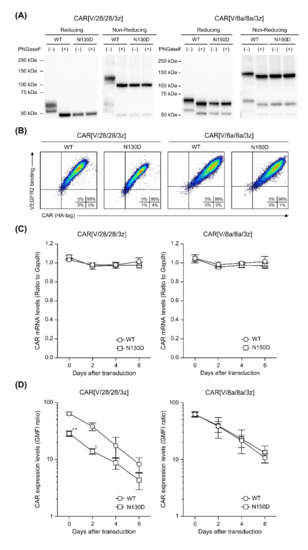 We constructed two structural variants of CAR[V/28/28/3z] and CAR[V/8a/8a/3z] by substituting HD asparagines believed to be N-linked glycosylation sites with aspartate: CAR[V/28/28/3z](N130D) and CAR[V/8a/8a/3z](N150D) (Figure 2). The proteins extracted from CAR-T cells expressing these variants were subjected to Western blotting under reducing and non-reducing conditions after deglycosylation treatment (Figure 4A). CAR[V/28/28/3z](N130D) shifted towards the smaller-molecule side relative to CAR[V/28/28/3z], and its band position did not change after treatment with PNGaseF, revealing that CAR[V/28/28/3z] undergoes N-linked glycosylation at the single substituted asparagine residue. Similarly, a downward band shift was observed for CAR[V/8a/8a/3z](N150D) relative to CAR[V/8a/8a/3z], and no change in band position was observed after PNGaseF treatment. Thus, we confirmed that CAR[V/8a/8a/3z] undergoes N-linked glycosylation at the single substituted asparagine residue.